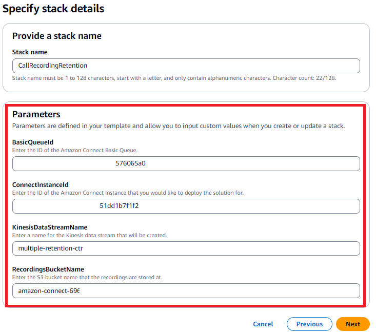 ConnectInstanceId field in your other tab containing the CloudFormation template parameter input form.c) KinesisDataStreamName