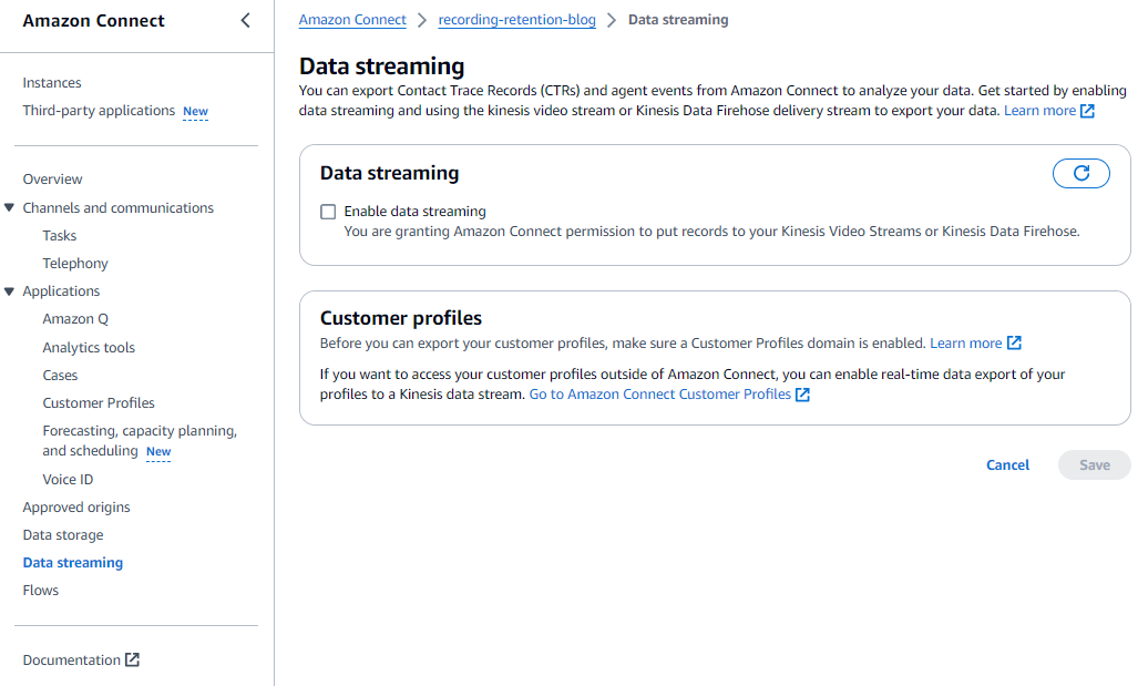 The Amazon Connect Instance should be configured to send Contact Trace Records (CTR) data to the “multiple-retention-ctr” Kinesis Data Stream. This can be achieved by visiting the “Data streaming” section of the Amazon Connect Instance configuration screen in the AWS Management Console.