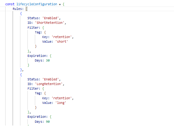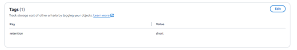 This code extracts the value of the retention attribute and creates a tag with key ‘retention’ and value obtained from ‘retentionvalue’, applies the tag to the Amazon S3 Object using ‘PutObjectTagging’ API.