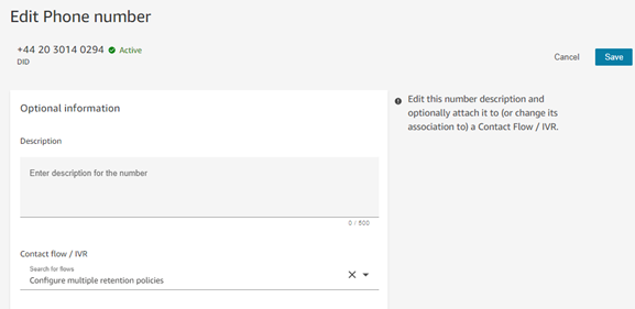 This step associates the Contact Flow deployed by the CloudFormation template to the phone number for testing the solution.